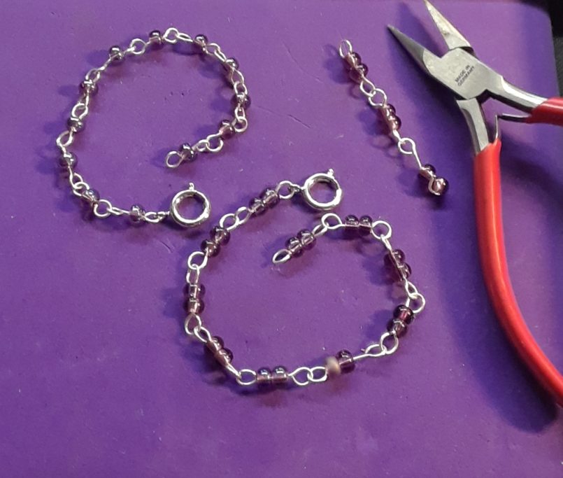 Wire & Bead link Bracelet: Silver wire and beads, using a tool kit provided, each person will cut, file and bend wire to make links of a necklace which are then assembled with beads to make a chain bracelet. 60-minute class. $50.00 per person. Ages 12 and up